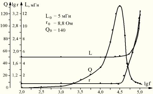 частотные зависимости индуктивности L, активного сопротивления r и добротности Q определены в диапазоне 0,1 – 100