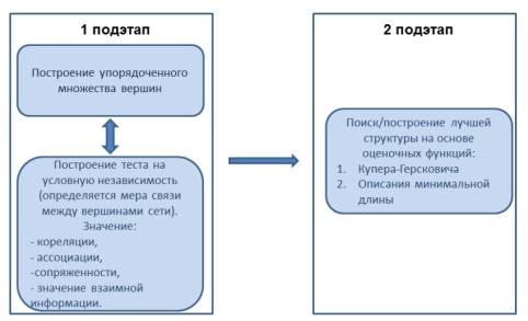 - на первом этапе происходит построение структуры и оценивание параметров (реализован алгоритм К2, который выполняет поиск структуры с максимальным значением функции Купера-Герсковича; для работы алгоритма нужно также иметь упорядоченное множество вершин);