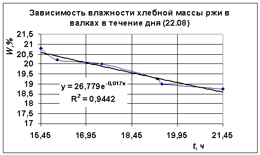 Обработанные с помощью ЭВМ графики (см. рис.1 ¸ 3) показывают, что влажность зерна в течении дня уменьшается по экспоненте, о чем говорит коэффициент достоверности аппроксимации (R2). Он колеблется в пределах от 0,76 до 0,98 [20,91,131].