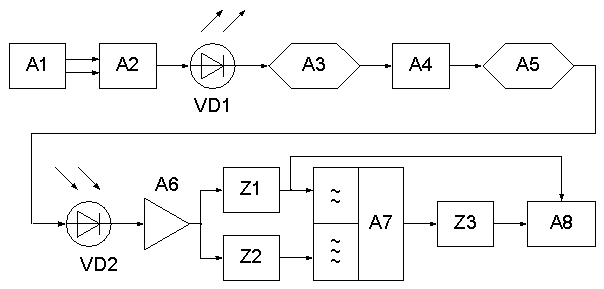 описується виразом (5) з виходу фотодіода VD2 підсилюється підсилювачем А6 і