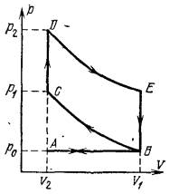 (ветвь АВ). При втором ходе поршня горючее адиабатически сжимается от V1