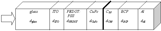 слоев ITO(80нм)/ PEDOT:PSS(80нм)/CuPc(20нм)/C60(20нм)/BCP(80нм)