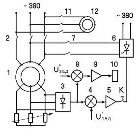 Цепь контроля состоит из блока сравнения 8, усилителя постоянного тока 9 и реле 10, управляющего контактами 11. В процессе динамического торможения блок 8 сравнивает напряжение на выходе выпрямителя 3 с заданным напряжением U’’зад. Если напряжение на выходе выпрямителя 3 больше величины U’’зад, сигнал с выхода блока 8 поступает через усилитель 9 на реле 10. В этом случае контакты 11 замкнуты, колодочный тормоз разомкнут, и торможение механизма осуществляется двигателем 1 в режиме динамического торможения. Когда напряжение на выходе выпрямителя 3 становится меньше напряжения U’’зад, на выходе блока 8 сигнал пропадает, и катушка реле 10 обесточивается. При этом контакты 11 размыкаются, и срабатывает колодочный тормоз.