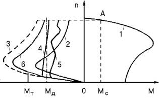 Когда напряжение на выходе выпрямителя 3 меньше заданного, к усилителю 5 не поступает сигнал отрицательной обратной связи и на вход тиристорного выпрямителя 6 подается напряжение, полностью отпирающее тиристоры, что приводит к возрастанию тока в обмотке статора и, следовательно, к увеличению момента двигателя. При этом двигатель стремится перейти с механической характеристики 1 (рис. 2) на характеристику 3, которая выбирается из условия обеспечения низкой частоты вращения ротора. Когда напряжение на выходе выпрямителя 3 превысит величину заданного напряжения, на вход усилителя 5 подаётся напряжение отрицательной обратной связи, что уменьшает его выходной сигнал. Благодаря этому уменьшаются ток возбуждения в обмотке статора и момент торможения электродвигателя, который работает на механической характеристике 4 (рис. 2) с почти постоянным моментом Мд.