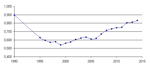 (0,832) has not yet reached the 1990 level (0,895). On the basis of