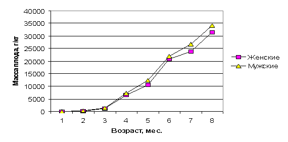 плода превосходила двухмесячных на 46 г, то у четырехмесячных - на 275 г, а