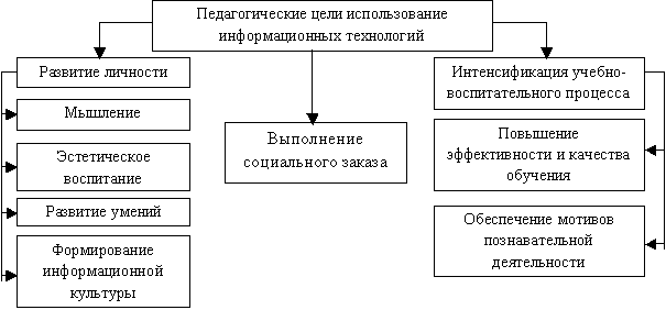 Появление информационного общества и закат индустриальной эры ознаменовался распространением таких технологий, как: электронные информационные ресурсы, мультимедиа, цифровая связь, разнообразные устройства записи и воспроизведения информации, а также широкие возможности анализа, обработки данных, которые раньше были доступны только крупным научным организациям. Совокупность вышеописанных технологий позволяет широко внедрить новую концепцию применения информационных технологий в образовании. Она заключается в том, что информационные технологии используются для личностно - ориентированного развития учащихся, преподавателей, родителей и других участников процесса обучения. Педагогические цели использования информационных технологий изображены на рисунке 1.