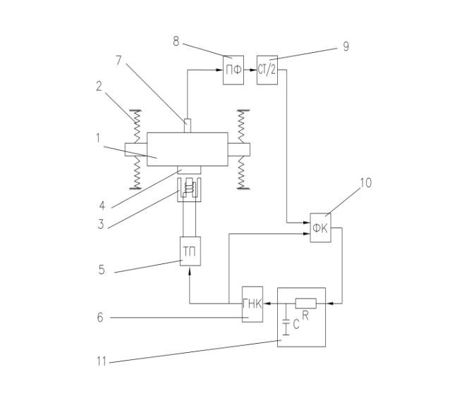 вiбрацiйного давача 7 рiзняться по частотi та фазi. Фазовий компаратор 10 рееструє цю рiзницю перетворюючи її в послiдовнiсть iмпульсiв певної тривалостi.