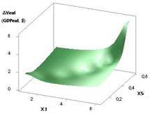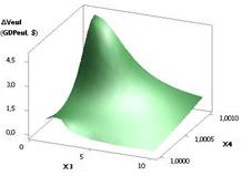 Рис. 4. DVeul (GDPeul) = f(Х1, Х2, Х3, Х4, Х5) Х1 = Х2 = 1, Х3 = 1…10, Х4 = 1…0,1, Х5 = 0,99 |