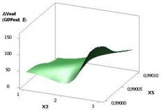 Рис. 11. DVeul (GDPeul) = f(Х1, Х2, Х3, Х4, Х5) Х1 = 1, Х2 = 1..10, Х3 = Х4 = 1..0.1, Х5 = 0,1..0,99 |