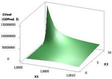 Рис. 8. DVeul (GDPeul) = f(Х1, Х2, Х3, Х4, Х5) Х1 = Х3 = 1…0,1, Х2 = 1…10, Х4 = 1, Х5 = 0,99 |
