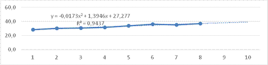Болжам 2018 жыл: У= -0,0173*9*9+1,3946*9+27,277=38,4
