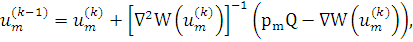 градиент дискретного аналога потенциальной энергии деформации;m - номер шага нагрузки; k-номер итерации.