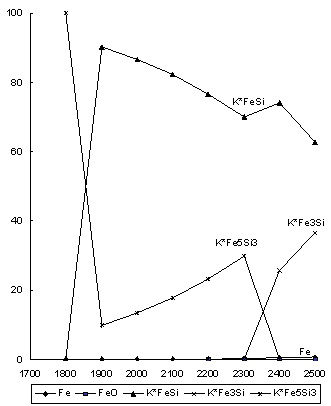 характеризуется образованием 4 элементами и соединениями: Fe, FeSi, Fe5Si3, Fe3Si, Si, Si2, Si3, CO, CO2 и т.д. Из рисунка 1, можно наблюдать, что степень