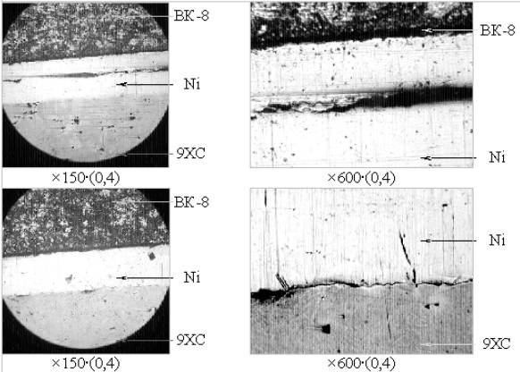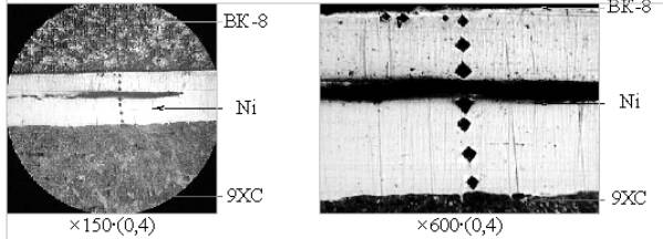 в зоне соединения через прослойку никеля Н2 твердого сплава ВК8 и стали 9ХС