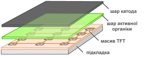 випромінює світло, коли до нього прикладена напруга. OLED - дисплей складається з декількох