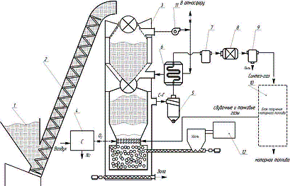 –Технологическая схема процесса газификации:1 – бункер с сырьем; 2 транспортер