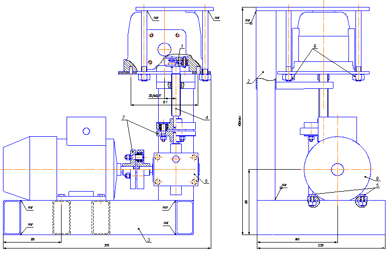 болты; 6 –гайки; 7 – муфты; 8 – редуктор червячный; 9 – электродвигатель