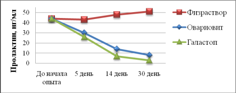 Для оценки эффективности лекарственных препаратов наблюдали за уровнем пролактина в крови кошек на 5, 14 и 30 сутки (Рисунок 8).