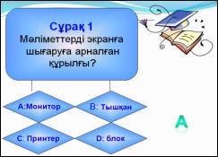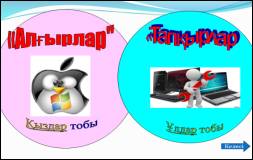 ақылдасып, өз жауаптарын айтады. Екі топ та тандап болған соң, дұрыс жауап экранға