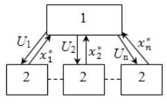 Структура складної системи: 1 – центральний орган управління, 2 підсистеми, u – керувальні дії, x – вихідні змінні