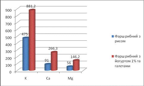 мінеральних елементів, таких як калій, кальцій, магній. Графічна залежність мінерального складу нових рибного фаршу «Щедро» (з
