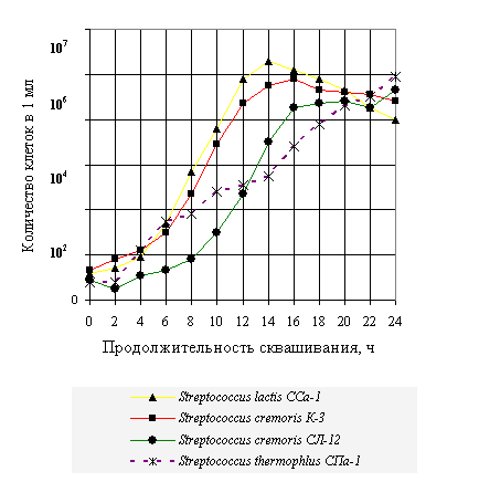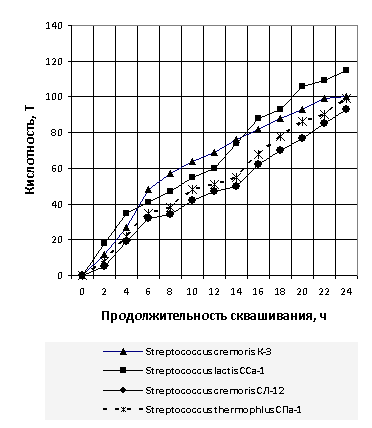 по активности кислотообразования использовали следующие штаммы S. cremoris СЛ-12, S. cremoris К-3, S. lactis