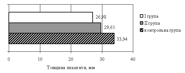 у вагітних (ІІ) групи – 29,61±0,5 мм, а у здорових вагітних товщина плаценти