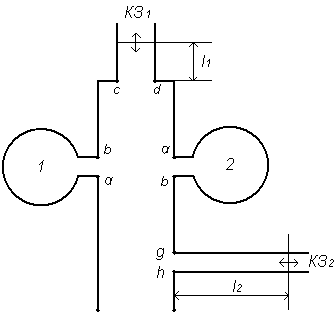 решітки живляться двопровідною лінією, в яку включені два шлейфи в точках c, d i g, h. Якщо короткозамикач КЗ1