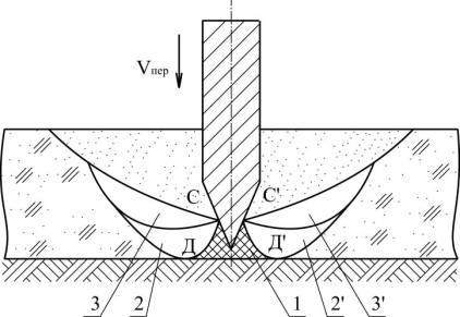 з шаром льоду: 1 - ядро ущільнення конусного типу; 2, 2' - зона кінцевих деформацій;