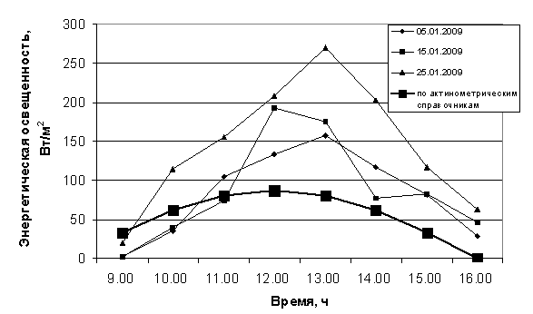 актинометрических наблюдений для 05.01.09 г. на 30 %, 15.01.09 г. на 40 %,