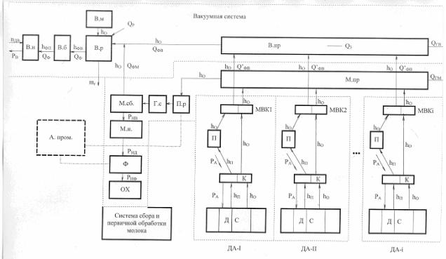 молокопровода; М.пр – молокопровод; МВК1, 2…i – молочно-вакуумный кран; М.сб – молокосборник; М.н –