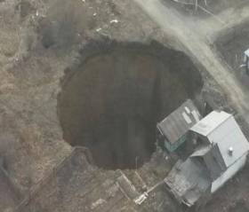 воронка с диаметром 30 метров, и с глубиной 20-25 метров. В Караганде усадка