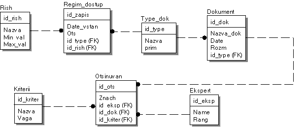 вигляд схеми бази даних (БД) наведено на рис. 2 за допомогою ER (enter-relationship) діаграми. Дана діаграма
