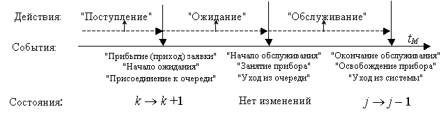 Рассмотрим действия и события, имеющие место в системах на примере СМО типа G/G/1, где под состоянием системы понимается число заявок k, находящихся в ней в данный момент времени. Хронологическая последовательность действий и событий, имеющих место в такой СМО при прохождении через систему одной заявки, представлена на рисунке 1.
