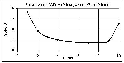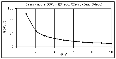зависимость GDPc, но при Х1еuc = Х2еuc = 1, Х3еuc = 1…10, Х4еuc =