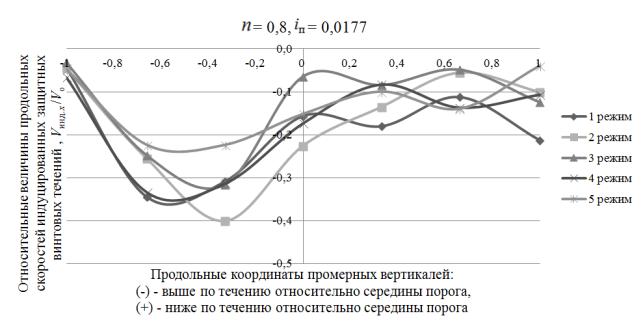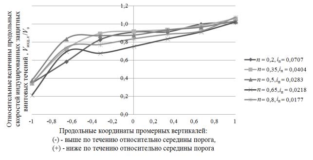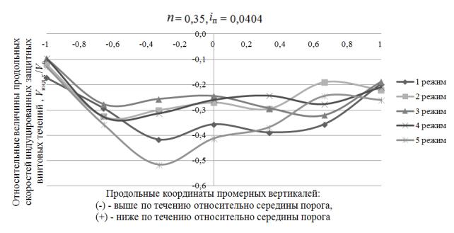 верховой грани порога в его центральной части. Скорости винтового течения по