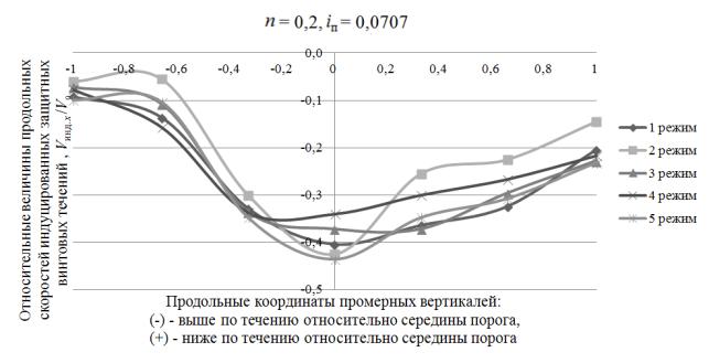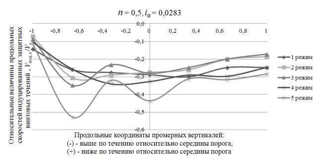 интенсивности защитных винтовых течений вдоль верховой и низовой граней порога