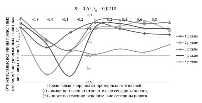 составляющих скоростей винтовых течений вдоль верховой грани порогов для каждой