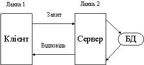 Дволанкова архітектура використовується в клієнт-серверних системах, де сервер відповідає на клієнтські запити безпосередньо і в повному обсязі, при цьому використовуючи тільки власні ресурси. Тобто сервер не викликає сторонні мережеві програми, але не звертається до сторонніх ресурсів для виконання будь-якої частини запиту (рис. 2).