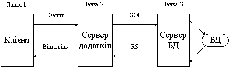 Ще одна тенденція в клієнт-серверних технологіях пов'язана з дедалі більшим використанням розподілених обчислень. Вони реалізуються на основі моделі сервера додатків, де мережевий додаток розділене на дві і більше частин, кожна з яких може виконуватися на окремому комп'ютері. Виділені частини додатка взаємодіють один з одним, обмінюючись повідомленнями в заздалегідь узгодженому форматі. В цьому випадку дволанкова клієнт-серверна архітектура стає триланковою (трирівнева, 3-х рівнева). Як правило, третьою ланкою в триланкової архітектурі стає сервер додатків (рис. 3).