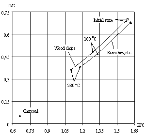 In the raw (wet) materials the O/C ratio varies in the range of 0.65 -