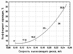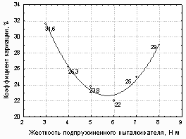 высевающего диска Vд = 0,106…0,198 м/с, скорости высевающего аппарата Vc = 1,3…1,7 м/с, жесткости подпружиненного выталкивателя семян S=4,75…5,55 Н·м. При этом коэффициент вариации будет