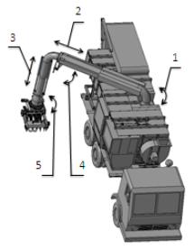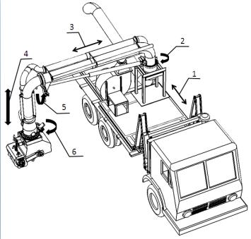 1 – разворот в плане с транспортным трубопроводом (на угол до 1300); 2 – горизонтальное выдвижение; 3 – подъем-опускание; 4 – отклонение в вертикальной плоскости (на угол до 450 в каждую сторону от вертикали; 5 – вращение (на угол до 1800).