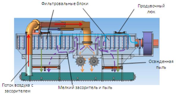 фракции засорителя и пыли из осадительных камер – периодически через подвижные
