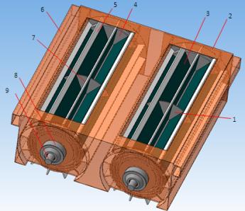 1, 7 – роторы; 2 – корпус, 3 – лопасть ротора; 4 – торцевые диски ротора с уплотнением; 5 – сменная пластиковая часть лопасти; 6 – скользун для установки устройства на емкость; 8 – подшипниковый узел, 9 – вал ротора.