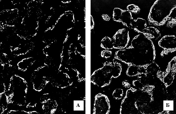 Рис.3. Світіння цитоплазми трофобласта хоріальних ворсинок після