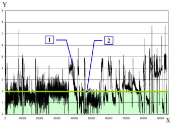 нагружений при остановке дефектоскопа в середине исследуемого участка |