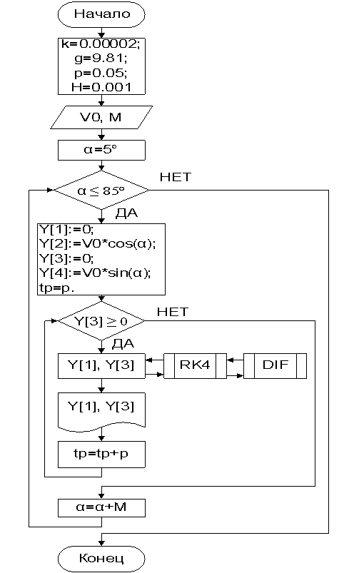предназначенный для вычисления характеристик полета снаряда в безвоздушном пространстве и с учетом