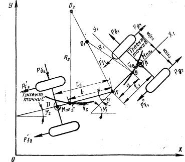 тяжести секций машины; φi - углы курса i–й секции; θ – угол складывания; Ri – радиусы поворота i–й секции; P'fi, P''fi – силы